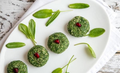 Обелете чесъна, изплакнете и нарежете спанака и магданоза не на много ситно. Сложете в блендера и направете хомогенна смес. Добавете лимоновия сок и сол на вкус. Може да добавите и малко черен пипер. Направете топки с рамер на орех или оставете нещата във вид на пастет както е.
